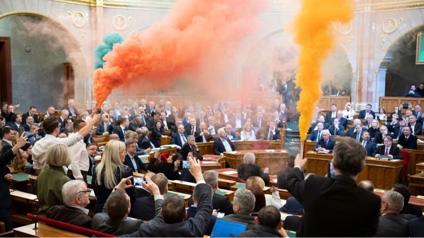 In nearby Hungary last month, a small knot of opposition MPs in Budapest opted for drama to fight-back, too: they released rainbow-colored smoke bombs in the Parliament to protest passage of a law by Viktor Orbán loyalists outlaw Pride and weaponize facial recognition software of Pride 2025 attendees. Orbán demanded the law be passed in response to massive recent anti-Orbán street protests marches in the capital and across Hungary. There, polls show the center-right opposition candidate, a mild-mannered sweater-vest wearing pol named Peter Magyar of the Tisza party, is more popular than Orbán and his Fidesz party.