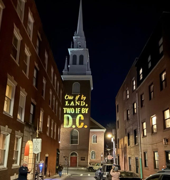 The picture above is a new public message that’s being delivered to residents of Boston by the Silence DoGood art collective. It’s a civic reclaiming of the commons they’ve been doing via projections onto historic buildings around Boston, including the Old State House, Faneuil Hall, and the Old South Meeting House. The group takes its name after one of Benjamin Franklin’s pen names, Mrs. Silence DoGood, adopted to get himself published in the local New England-Courant in 1722 after multiple rejections of articles under his own name. There are many others who are using projection, including upon Washington, DC, and Trump buildings around the world. They command attention. A public reminder: we dissent.