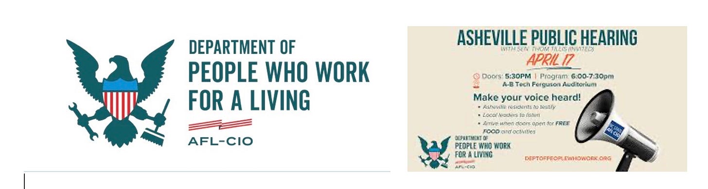 The AFL-CIO has been holding nationwide hearings on Trump’s attacks on civil servants and protections for workers; they call it the Department of People Who Work for a Living (DPWWL) – the workers’ antidote to DOGE.